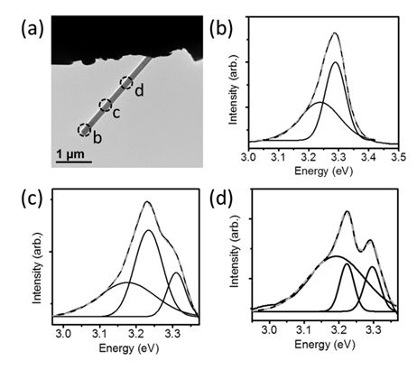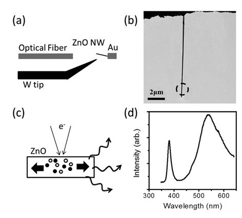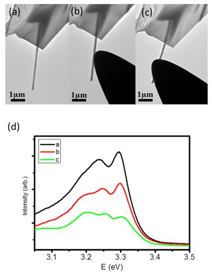 圖1:(a) 原位透射電子顯微鏡光學(xué)-光電測量系統(tǒng)應(yīng)用原理圖;(b) 單根ZnO納米線的TEM圖像,電子束被聚焦在納米線的末端。(c) 圖解ZnO納米線的發(fā)光機制; (d) 典型的CL譜。