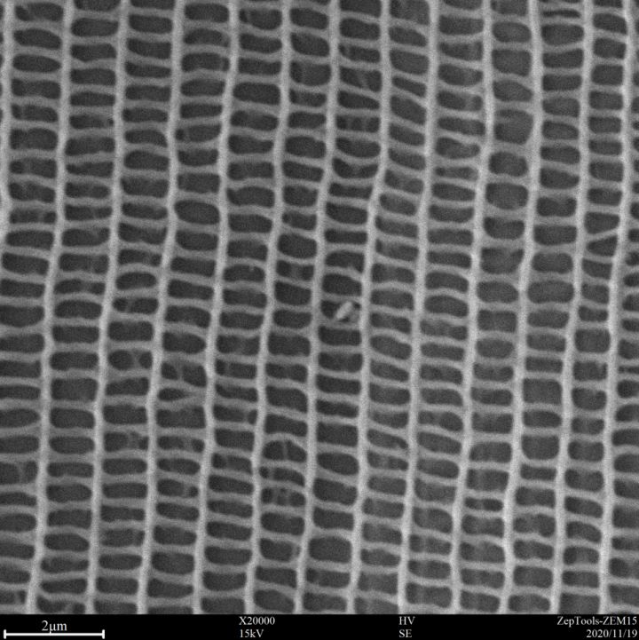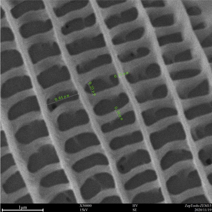 50000倍下,結(jié)構(gòu)色的奧秘盡收眼底,100-150 nm左右的細(xì)絲組成了300*650 nm左右的方格,這些方格進(jìn)而組成周期結(jié)構(gòu),就是這些密排結(jié)構(gòu)接受外來光線以后能發(fā)生不同的折射、干涉,然后反射出部分特殊光頻率的光線而產(chǎn)生不同的色彩。